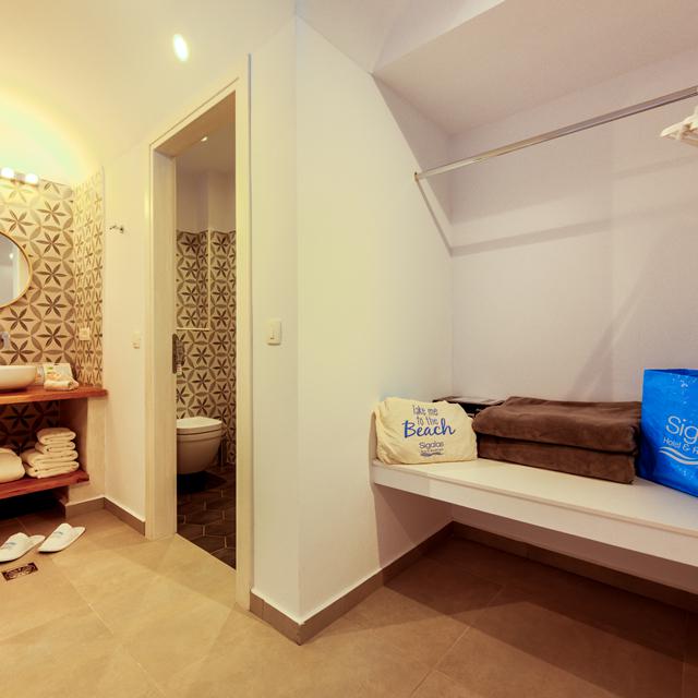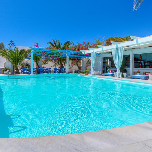 Ook de hotelkamer bestaat uit de typisch Griekse frisse witte en blauwe kleuren. De blauwe luikjes maken dit Griekse plaatje helemaal af. Wanneer je naar buiten stapt groeien op verschillende plekken kleurrijke bougainvilles. De roze bloemetjes steken prachtig af tegen de strakblauwe lucht. Bij de poolbar staan verkoelende drankjes en lekkere snacks op de kaart, bestel wat lekkers en kies een plekje aan het heerlijke zwembad uit.