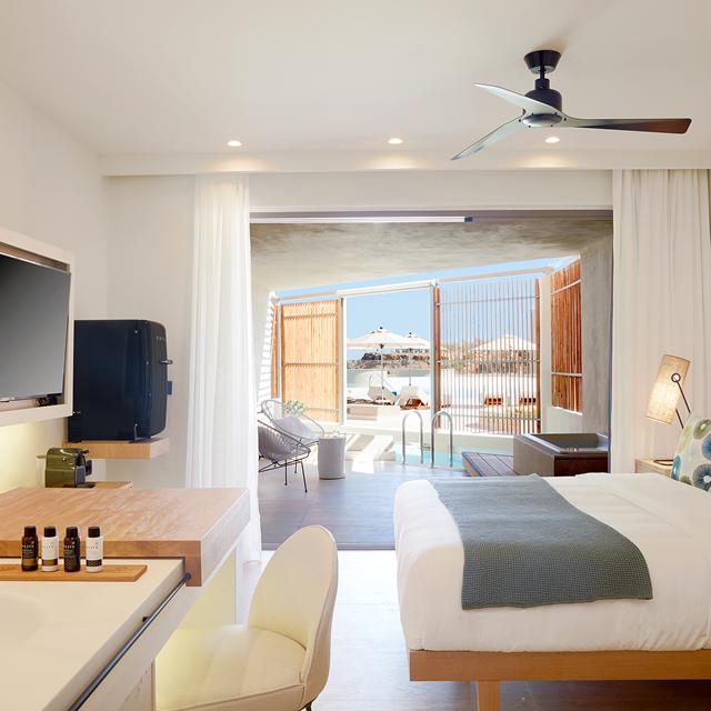 De schitterend gedecoreerde kamers zijn een oase van rust en luxe. Op het terras kun je heerlijk in je fluffy badjas van een fabulous view genieten, of even dompelen in de plunge pool of verwarmde jacuzzi. De service in dit hotel is tot in de puntjes verzorgd, zo wordt iedere dag de kamer ‘avondklaar’ gemaakt, zodat je zo je luxueuze bed in kunt rollen.