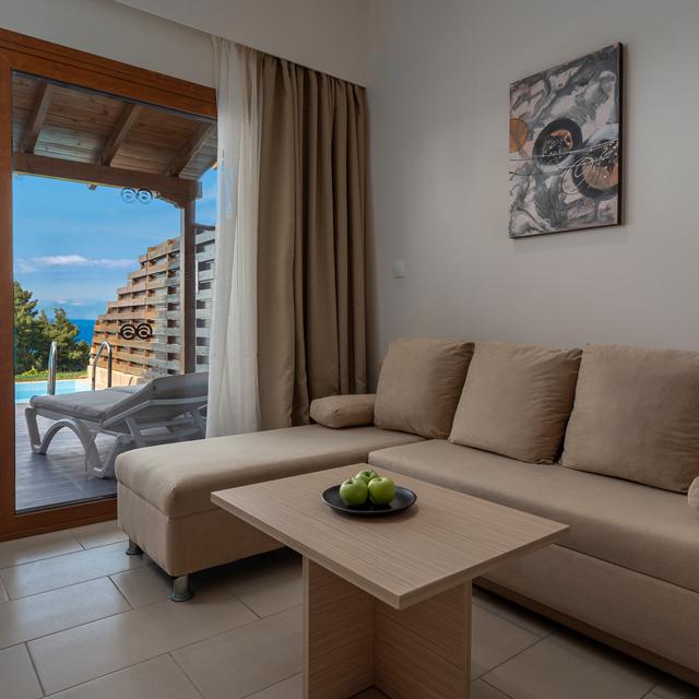Het fijne aan Alia Palace is toch wel, dat je aan de rand van het zwembad, met uitzicht over de golf, uren kunt ontspannen. Maar je bent ook zo met de gratis shuttle service op de gezellige boulevard van het druk bezochte Pefkohori met leuke winkels, restaurants en haar nachtleven.