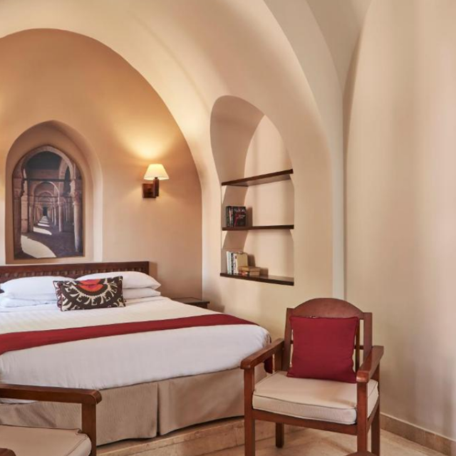 De sfeervolle kamers bevinden zich in kleine gebouwtjes die verspreid liggen over het terrein. Ze hebben uitzicht op de weelderige tuin van het hotel of op de lagune. Vanaf het zonneterras bij het zwembad kijk je ook uit op de lagune en loop je via een trapje zo het gemoedelijke strandje op. En vanaf de mooi aangelegde traptreden loop je zo de zee in. Ga je liever naar een groot strand, dan brengt het gratis shuttlebootje je naar Zeytouna Beach, een schitterend strand op een eilandje. Ook kan je de shuttleboot (tegen betaling) nemen naar de Marina haven.